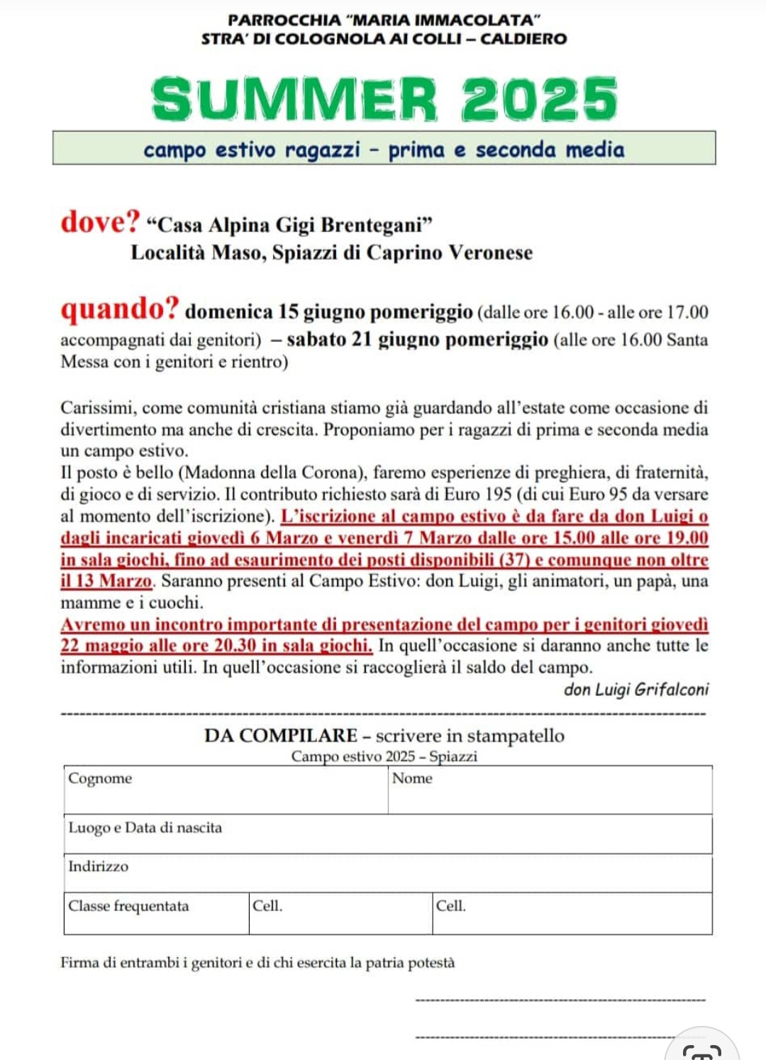 Il contributo richiesto sarà di Euro 195 (di cui Euro 95 da versare al momento dell’iscrizione). L’iscrizione al campo estivo è da fare da don Luigi e dagli incaricati giovedì 6 marzo e venerdì 7 marzo dalle ore 15.00 alle ore 19.00 in sala giochi, fino ad esaurimento dei posti disponibili (37) e comunque non oltre il 13 marzo.