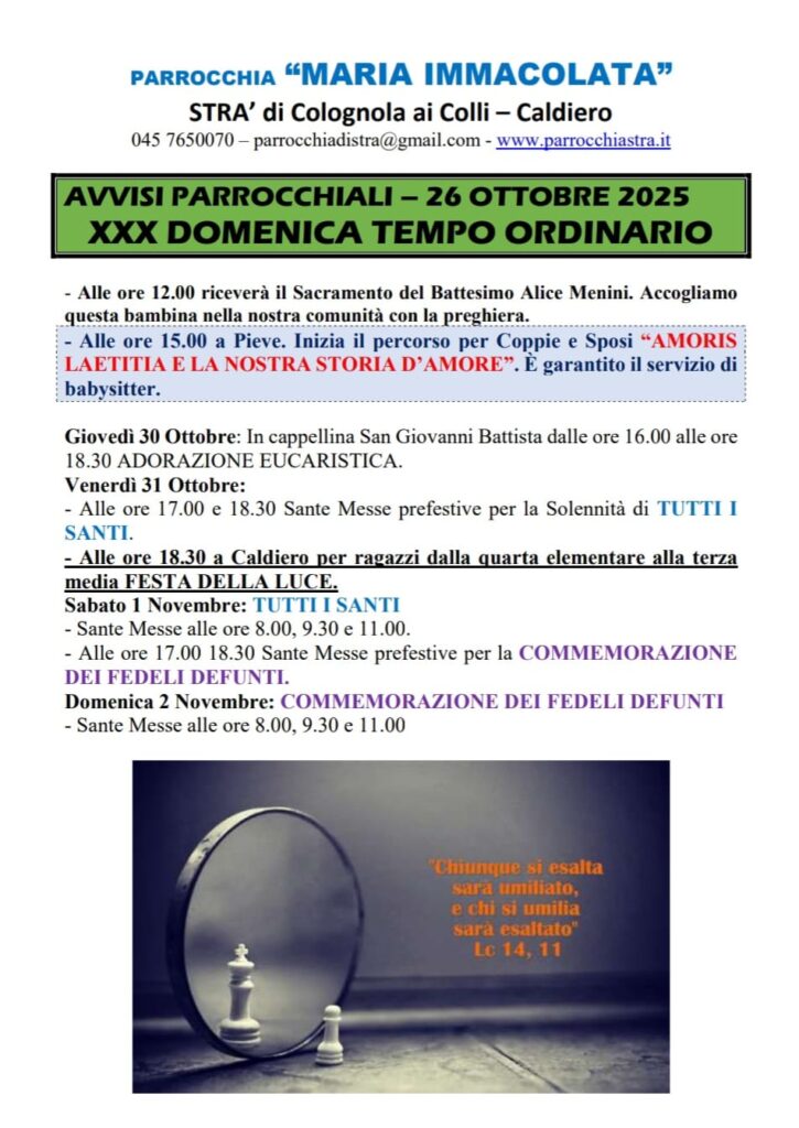 Sabato : 17.00 – 18.30Domenica : 8.00 – 9.30 – 11.00Lun-Mar-Mer-Ven : 8.15Giovedì : 18.30